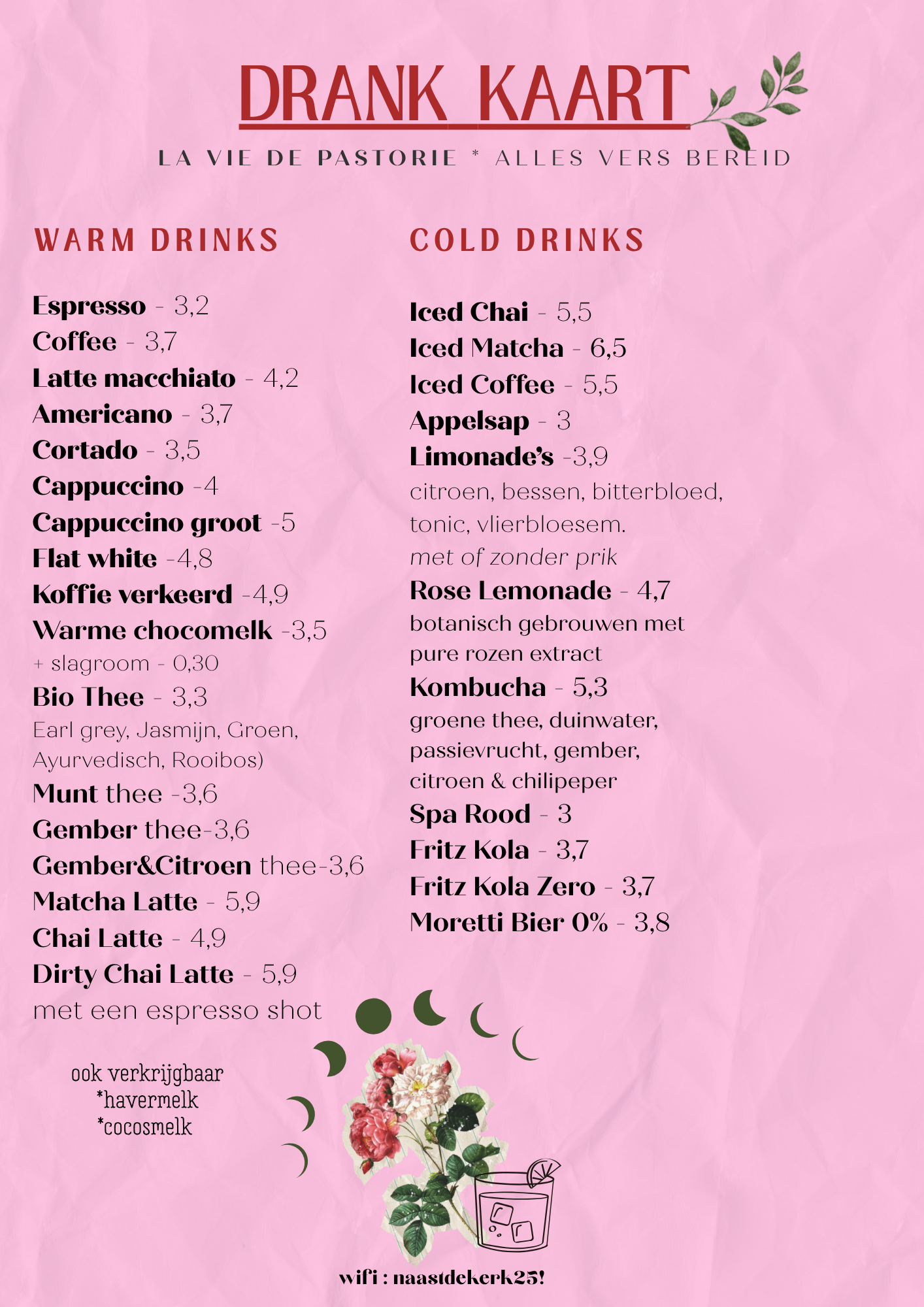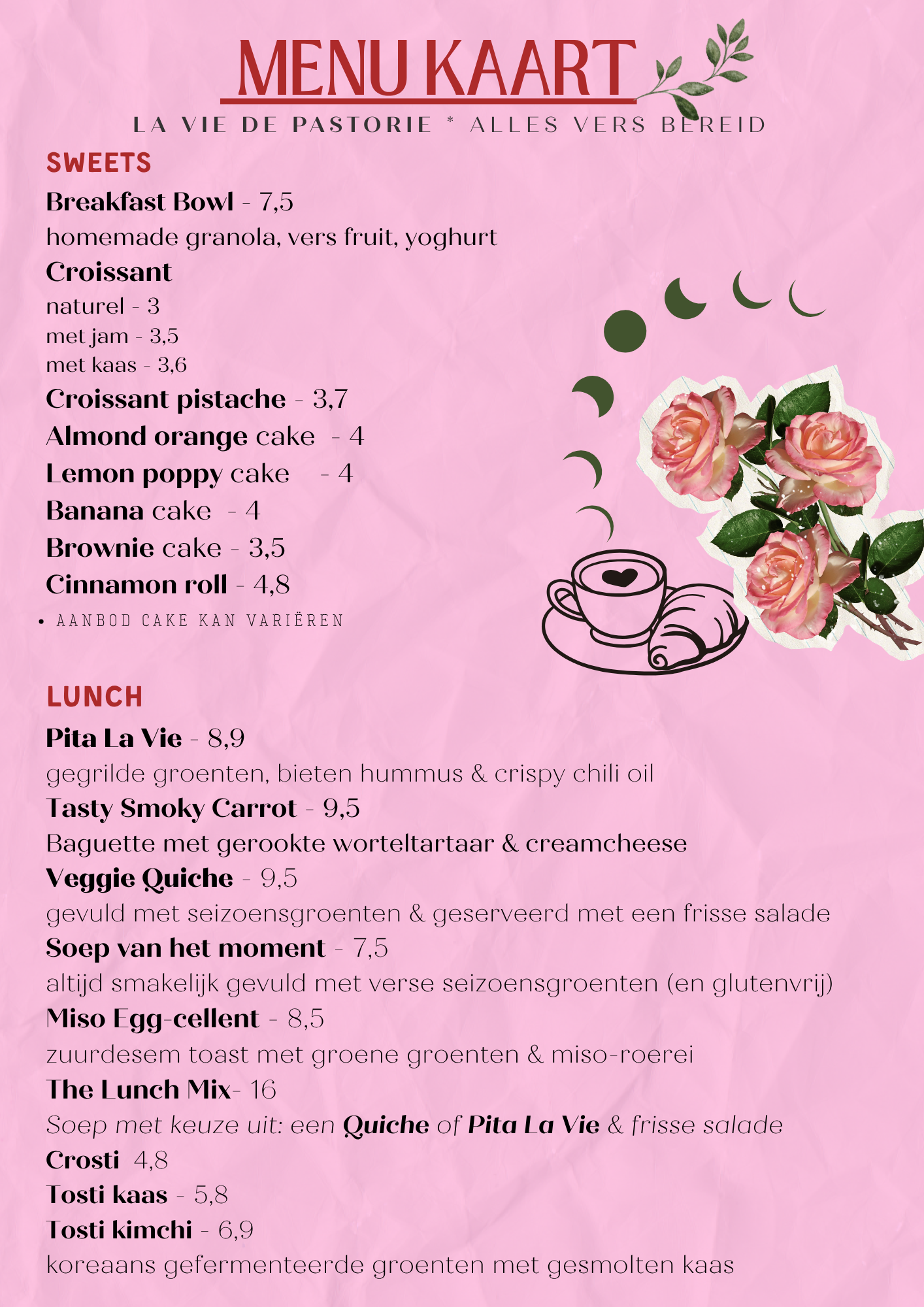 Pin ons er niet op vast want we wisselen regelmatig. Maar op dit moment hebben we verschillende cakes: Earl Grey, Lemon Poppy en Chocolate Tahini Brownie. Er zijn ook kokosmakronen en croissants.